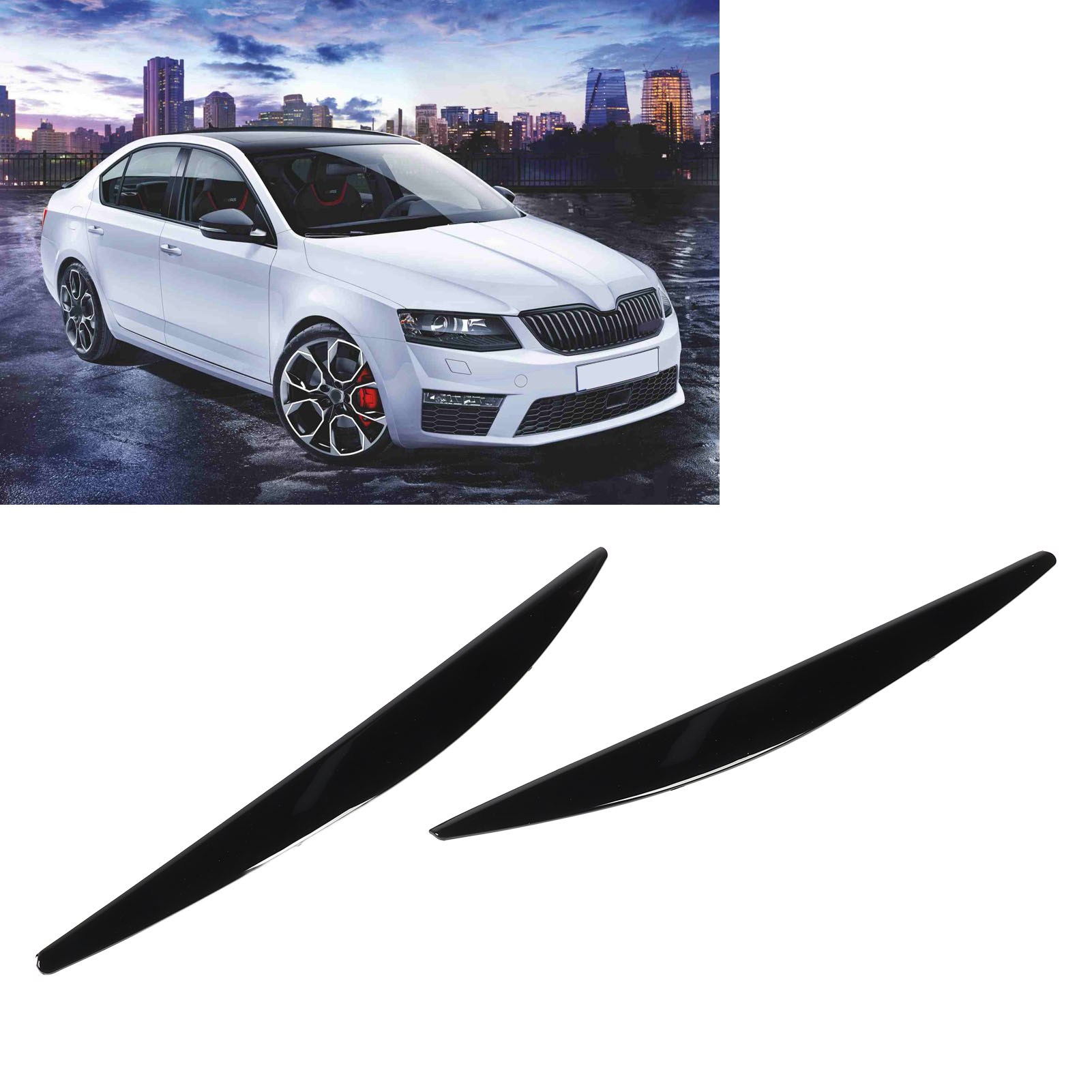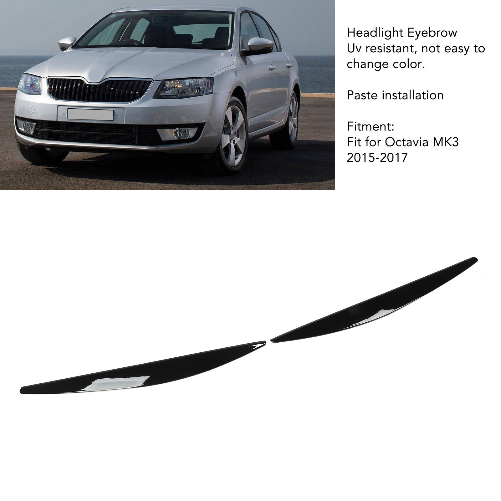 1、Applicable Model: Headlight eyebrow is replacement for Octavia MK3 2015 to 2017, please confirm whether your model is applicable before buying. 2、Decorative: The eyebrow uses the paint process, bright color, UV protection, not easy to change color, perfect decoration of your car, make your car more unique. 3、Durable ABS: Using premium ABS material, lightweight and durable, and durable in extreme weather. Professional manufacturing, high precision. 4、Protection: Protect the edge of your headlight from scratches, but also effectively reduce exterior impact on the headlight and extend the service life of the headlight. 5、Paste Installation: Use the own double sided tape to paste to the top of your headlight, do not need professional tools, simple installation, save time and energy.