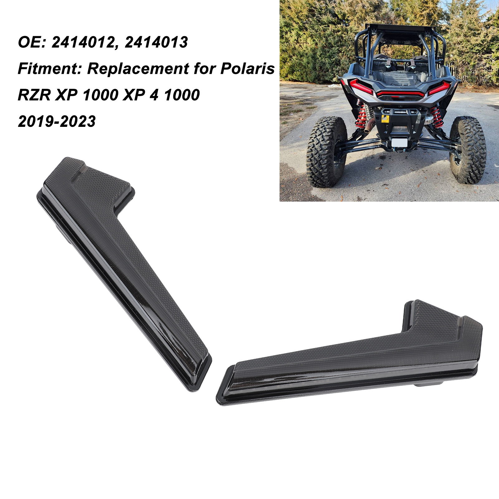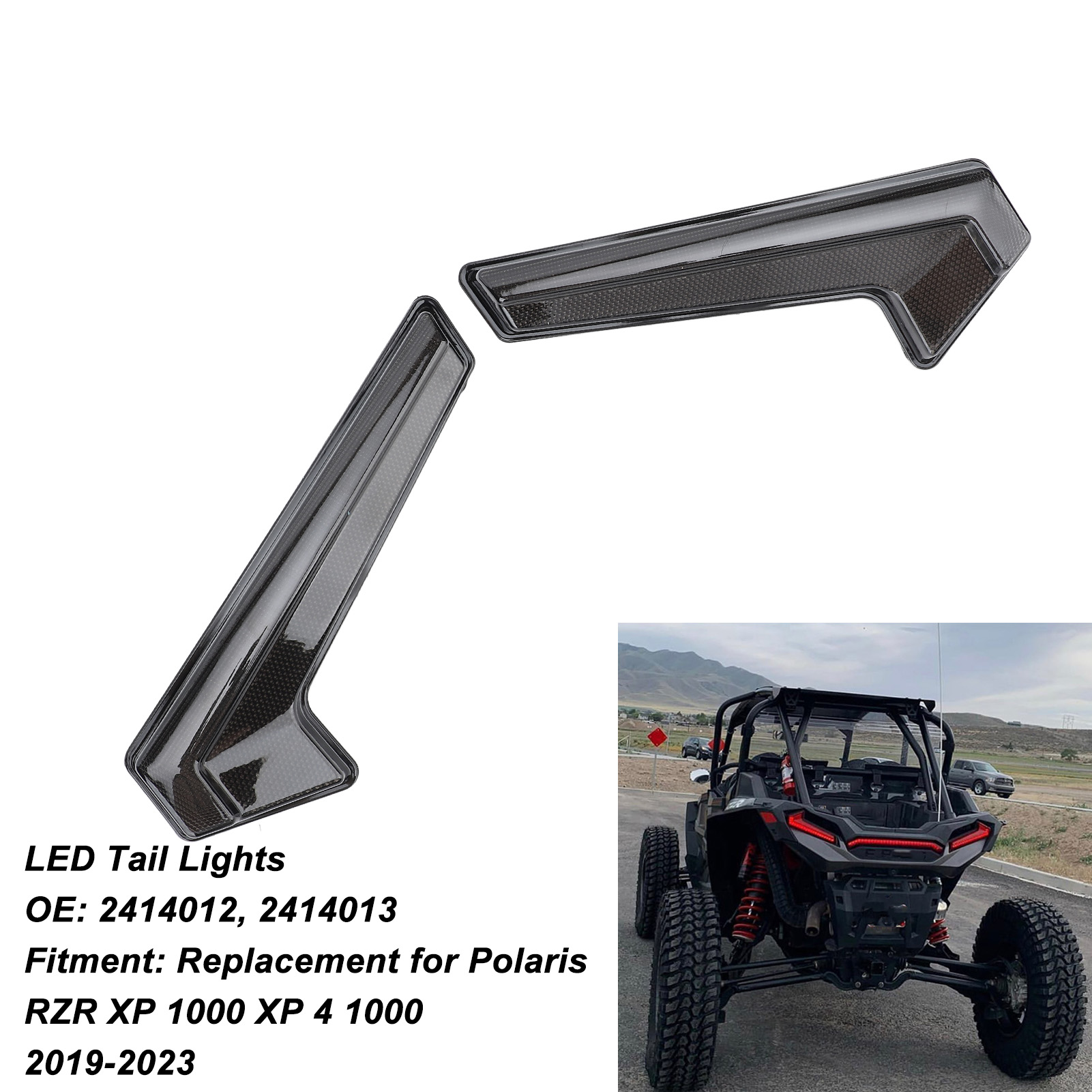 1、APPLICABLE MODEL: Designed replacement for Polaris RZR XP 1000 XP 4 1000 2019‑2023, these left and right rear tail lights are a perfect match and easy to install. 2、OE NUMBER: The referencing part number of the lights are 2414012, 2414013. Please make sure the OE number matches the part you are replacing. 3、ENHANCED VISIBILITY: Increase vehicle visibility with bright red light, enhancing safety and providing stronger protection for nighttime or inclement weather driving. 4、PREMIUM MATERIALS: Made of high strength ABS, PC materials, these tail lights are wear resistant, shock resistant, and durable for long term use in various harsh environments. 5、COMPLETE REPLACEMENT: Includes left and right rear tail lights, allowing for a complete replacement of the vehicle's tail lights without the need for separate purchases.