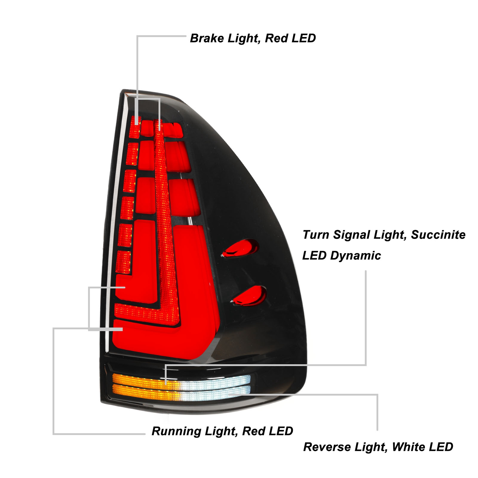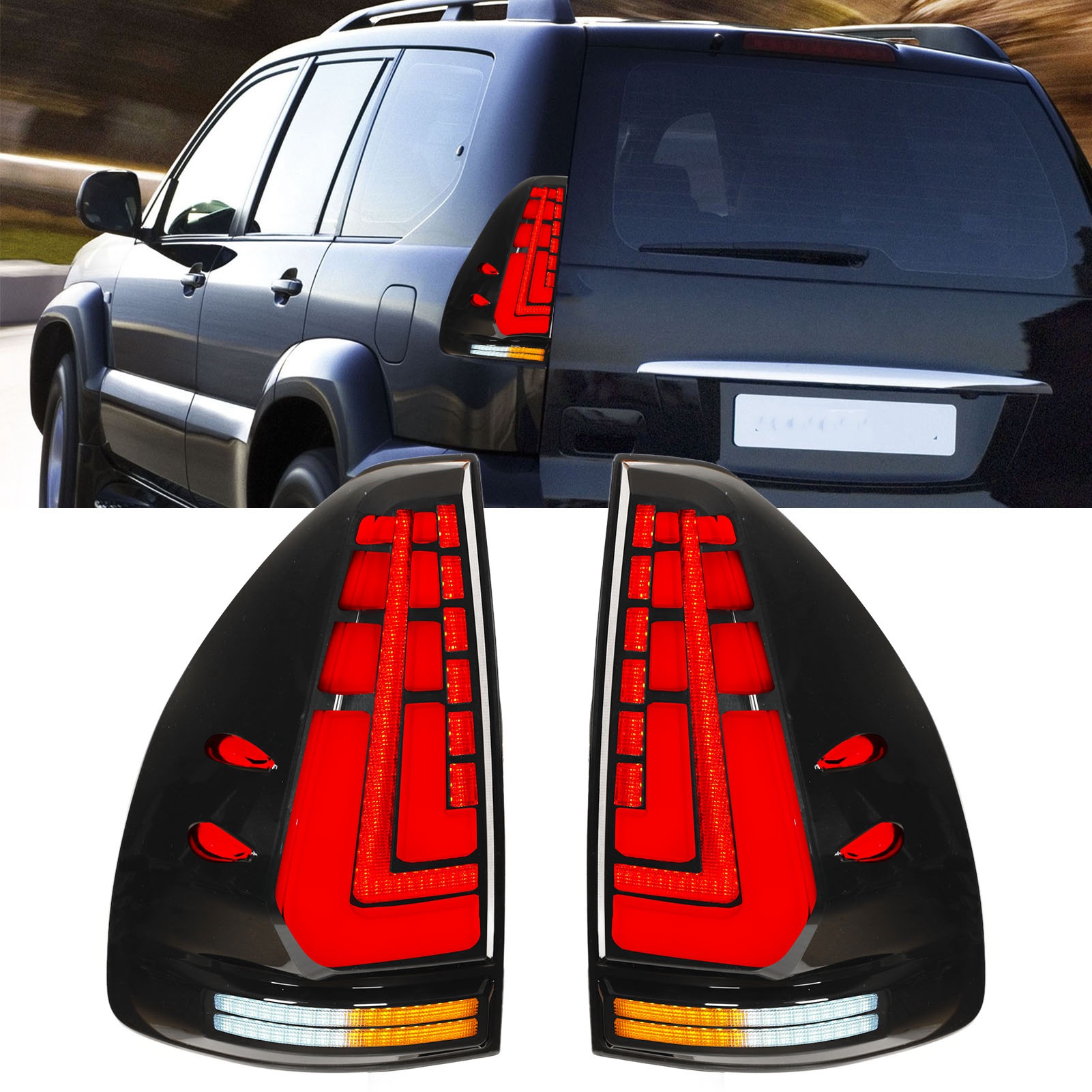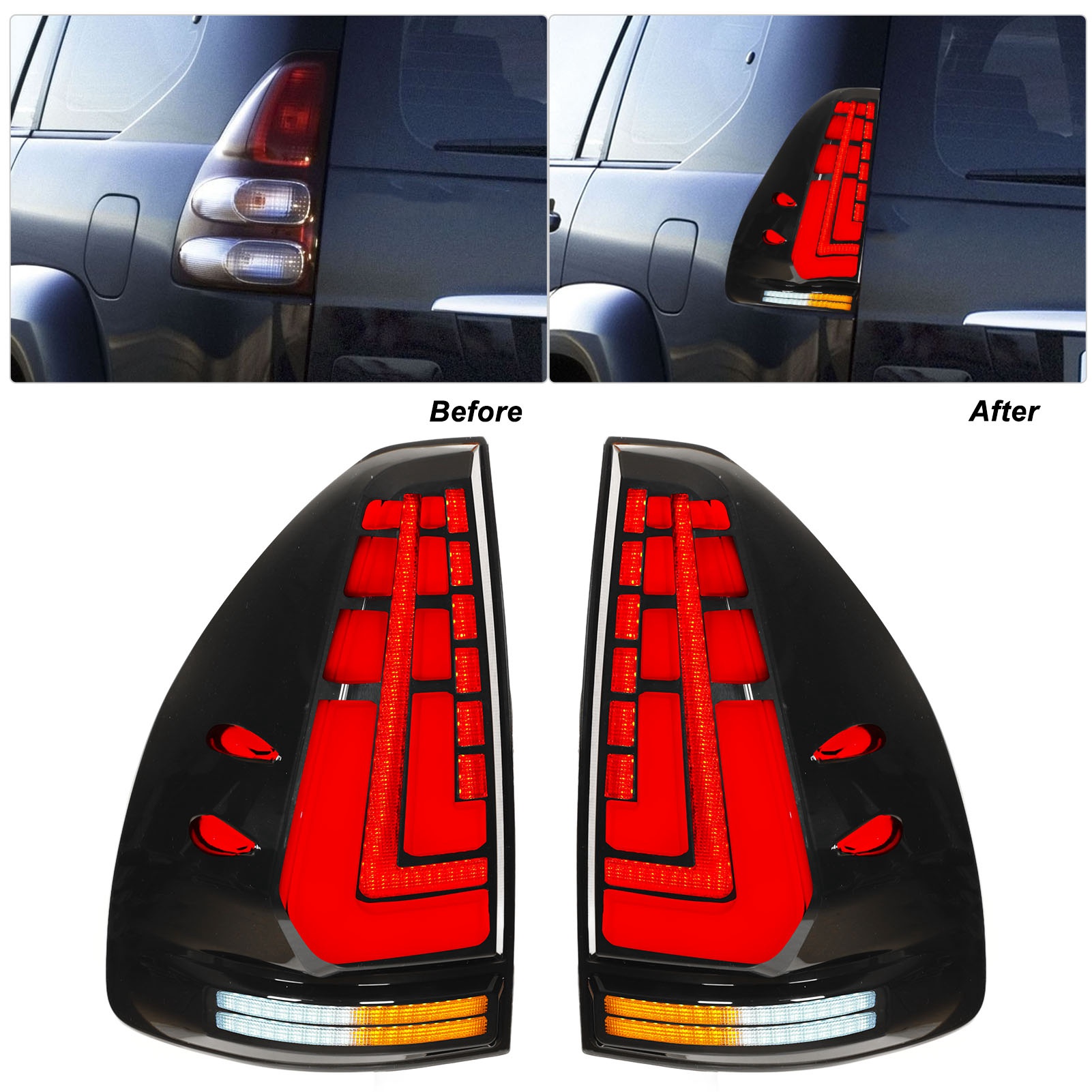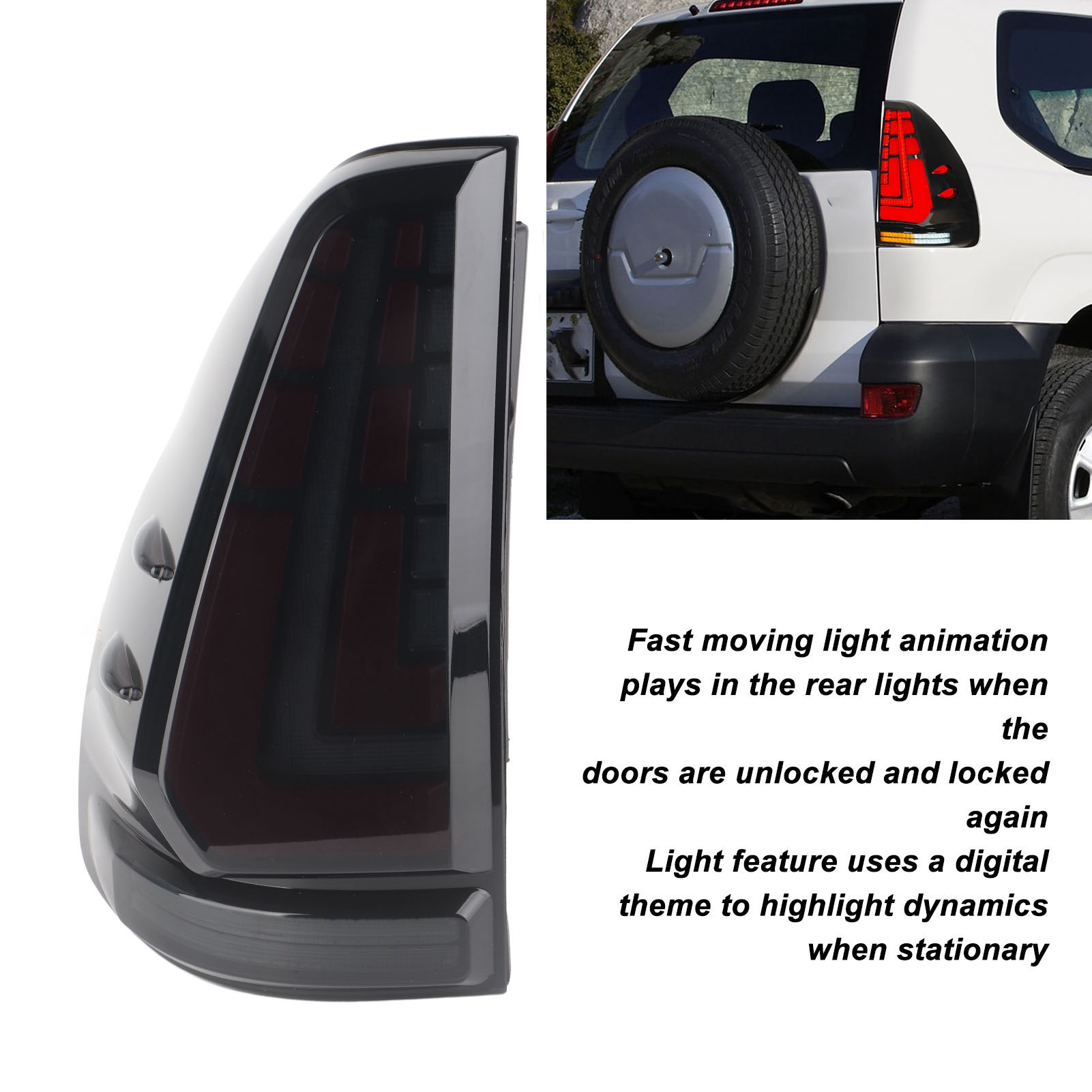 1、Suitable Model: This automotive tail light is suitable replacement for Land Cruiser Prado 120 series 2003‑2009. 2、PMMA Lens: This car LED taillight features a stylish design style with high brightness and PMMA lens to give you a stable usage process. 3、Multi Function: LED tail light includes brake light, reverse light, dynamic turn signal light, start welcome light and fog light. 4、Light Animation: Fast moving light animations play in the rear lights when the doors are unlocked and locked again. The light feature uses a digital theme to highlight dynamics when stationary. 5、Easy to Install: Automotive LED taillights are plug and play, easy to install, OE factory specifications, and are nice replacement parts for old or broken accessories.